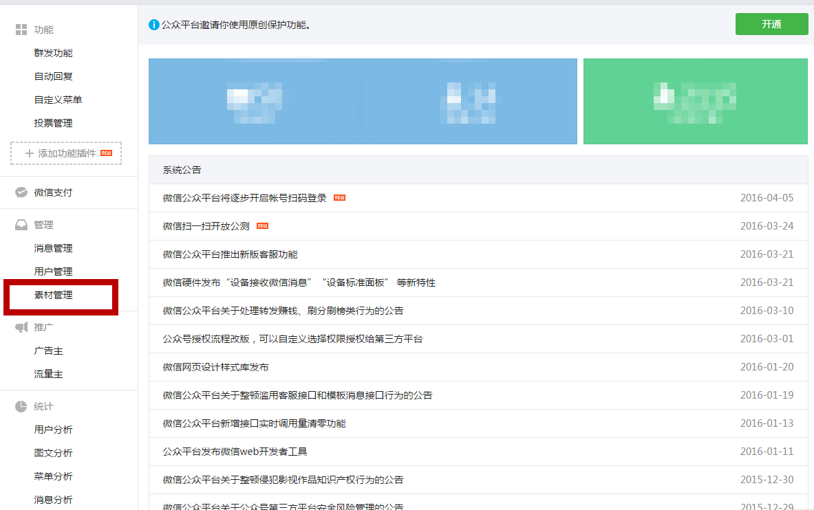 6、进入公众号点击“素材管理”即可编辑微信内容